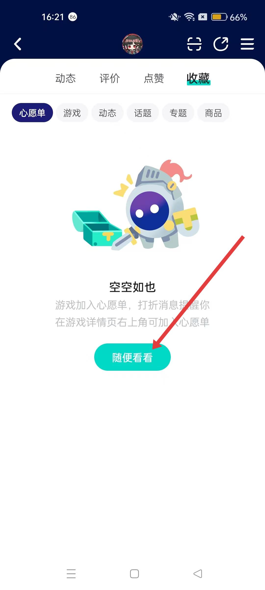 3、收藏的心愿單界面,若心愿單為空,可點擊隨便看看,瀏覽各類游戲,發現感興趣的游戲加入心愿單。