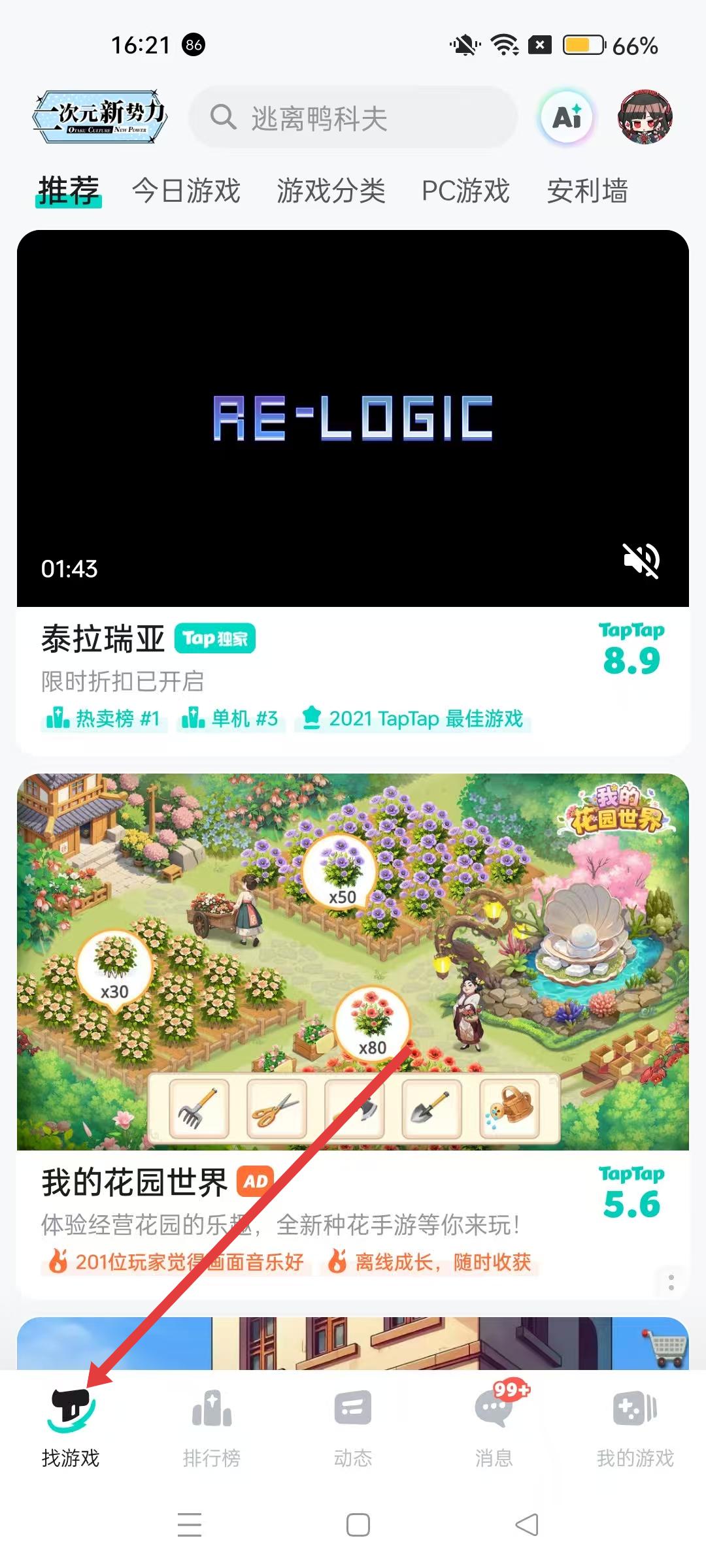 1、打開TapTap應用,進入找游戲界面,可瀏覽泰拉瑞亞、我的花園世界等推薦游戲,開啟游戲探索。
