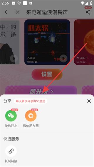 3、在分享頁面選擇分享渠道如微信好友、微信朋友圈等,將業務分享給他人,同時可獲得每天首次分享的50金豆獎勵。