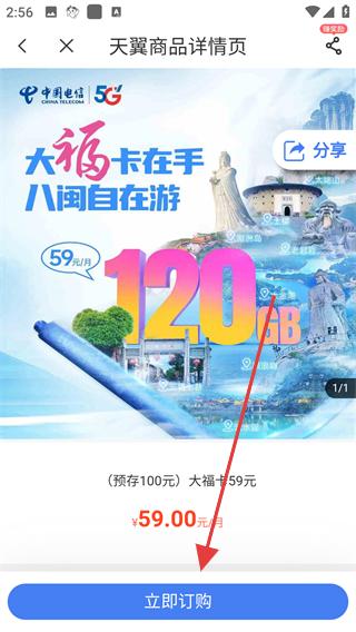 4、返回首頁選擇感興趣的商品如大???,進入商品詳情頁面,查看商品的價格、流量等信息,點擊立即訂購按鈕,完成商品的訂購,享受相應的服務。