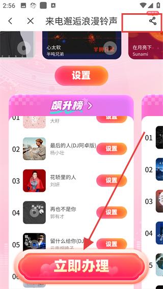 2、在業務詳情頁面,可選擇立即辦理按鈕,辦理如來電邂逅浪漫鈴聲的業務,也可點擊分享按鈕,進入分享頁面。