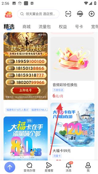 1、進入首頁可瀏覽精選板塊的各類業務如音頻彩鈴任換包等,點擊進入業務詳情頁面,查看業務的具體內容。