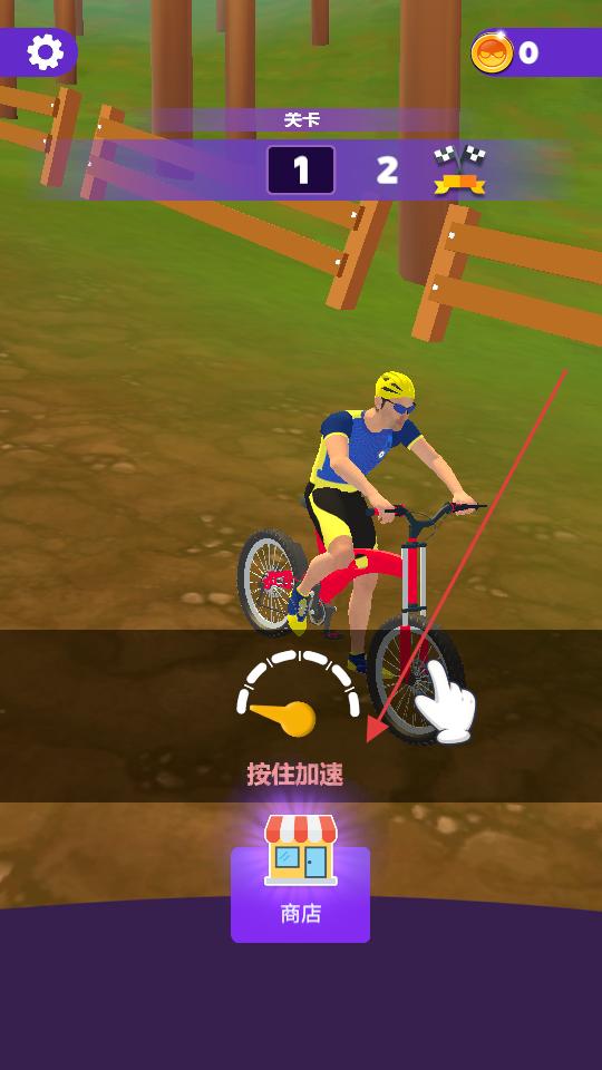1、進入單車向前沖游戲關卡1,按住加速按鈕,讓自行車開始行駛,此時留意速度表的變化,感受騎行的加速過程為后續在山林道路中競速做準備。