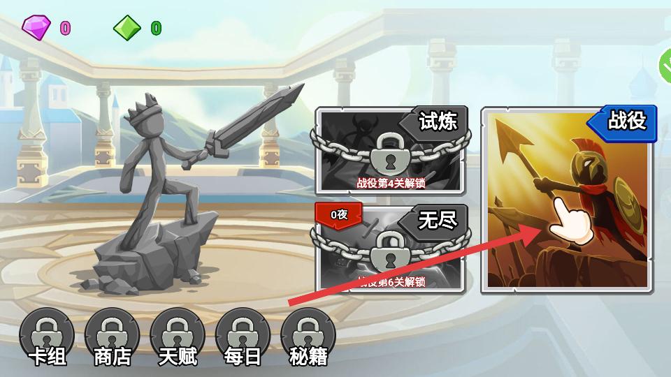 1、進入火柴人軍團世界大戰游戲,點擊戰役選項,進入戰役模式場景,此時留意界面中的資源數量和可解鎖內容,為后續招募和戰斗做準備。