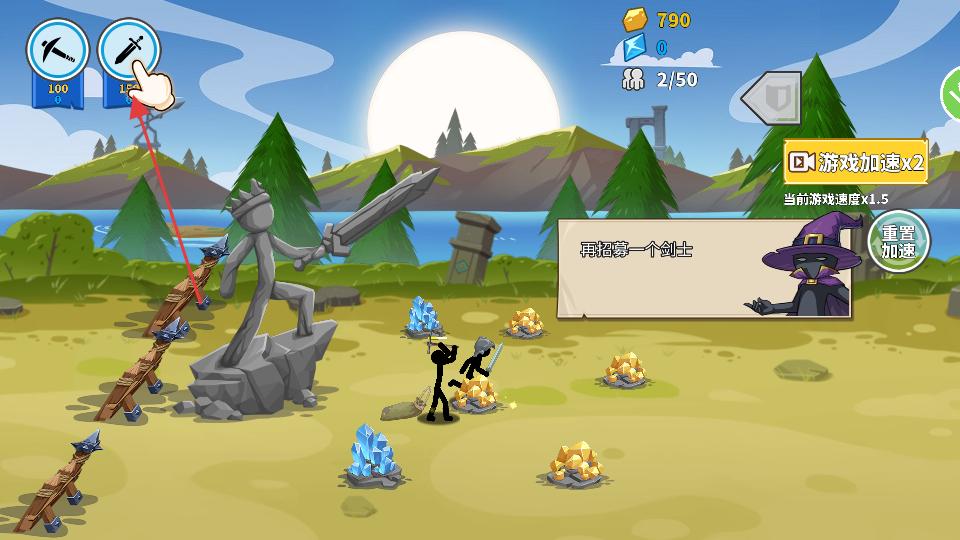 3、有了一定資源后點擊劍士招募按鈕,招募劍士,讓劍士加入戰斗隊伍,此時可看到劍士在場景中活動,準備參與后續的戰斗行動。