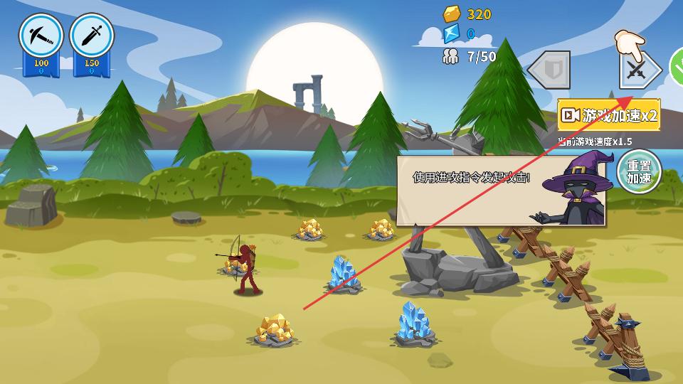 4、當需要發起攻擊時點擊界面右側的進攻指令按鈕,指揮隊伍發起攻擊,利用招募的礦工、劍士等單位,與敵人展開戰斗。