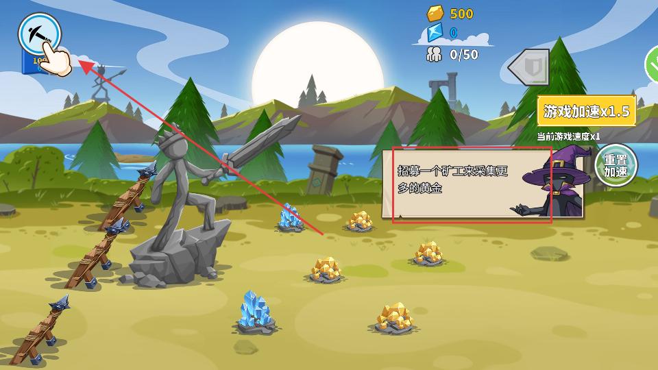 2、在戰役場景中點擊左側的礦工招募按鈕,招募礦工去采集黃金,通過采集獲取更多資源,為后續招募戰士等單位提供資源支持。
