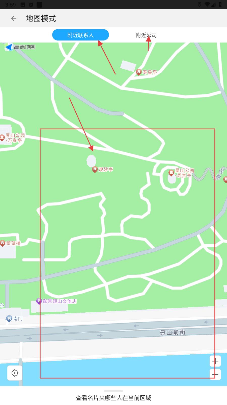 1、用戶可進入地圖模式,可切換【附近聯系人】【附近公司】標簽,查看名片夾中在當前區域的人脈,借助地圖定位功能,助力商務人士拓展周邊商務資源。