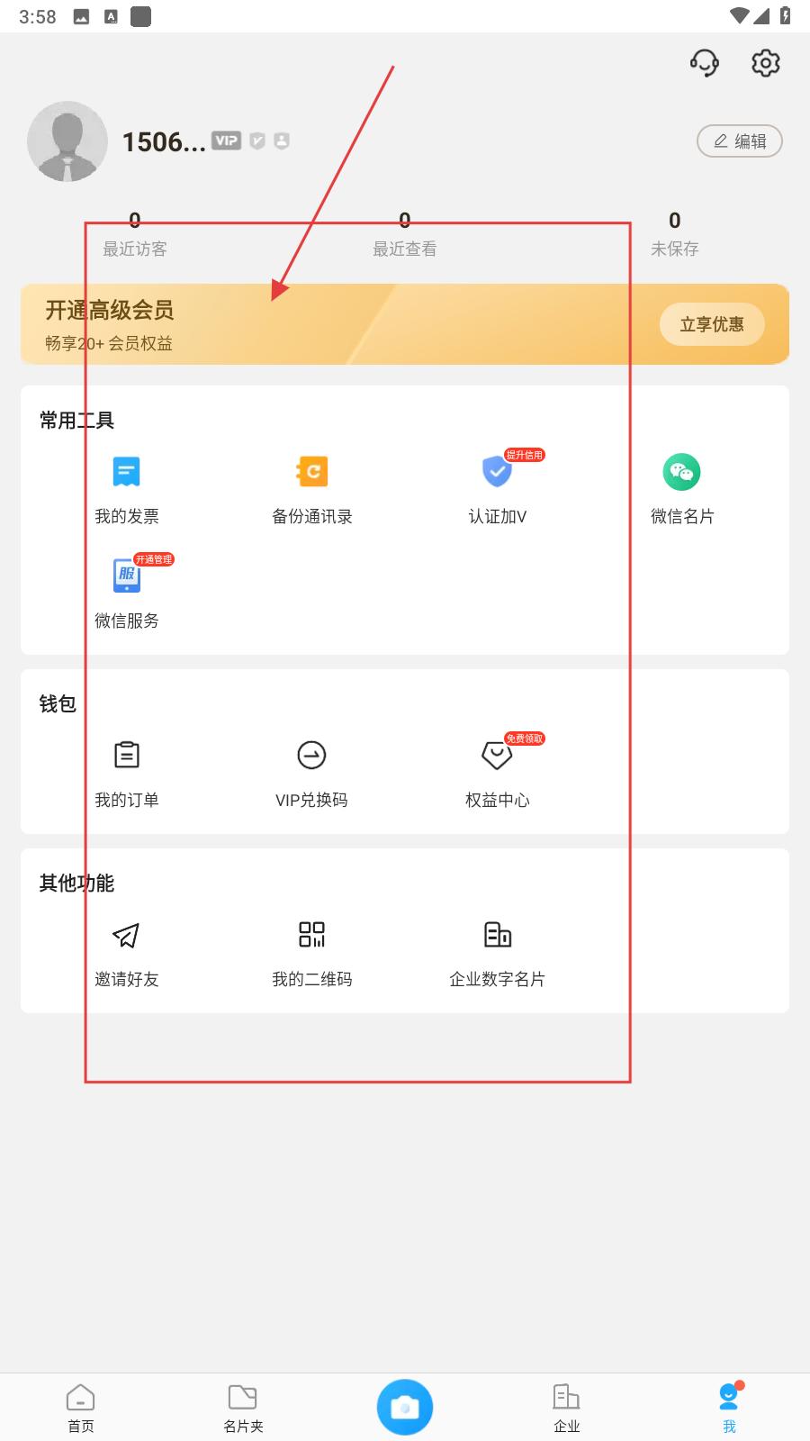 2、在【我】的界面,可開通高級會員暢享權益,常用工具含我的發票、備份通訊錄等,錢包板塊可管理訂單、VIP兌換碼,可生成個人二維碼及企業數字名片。
