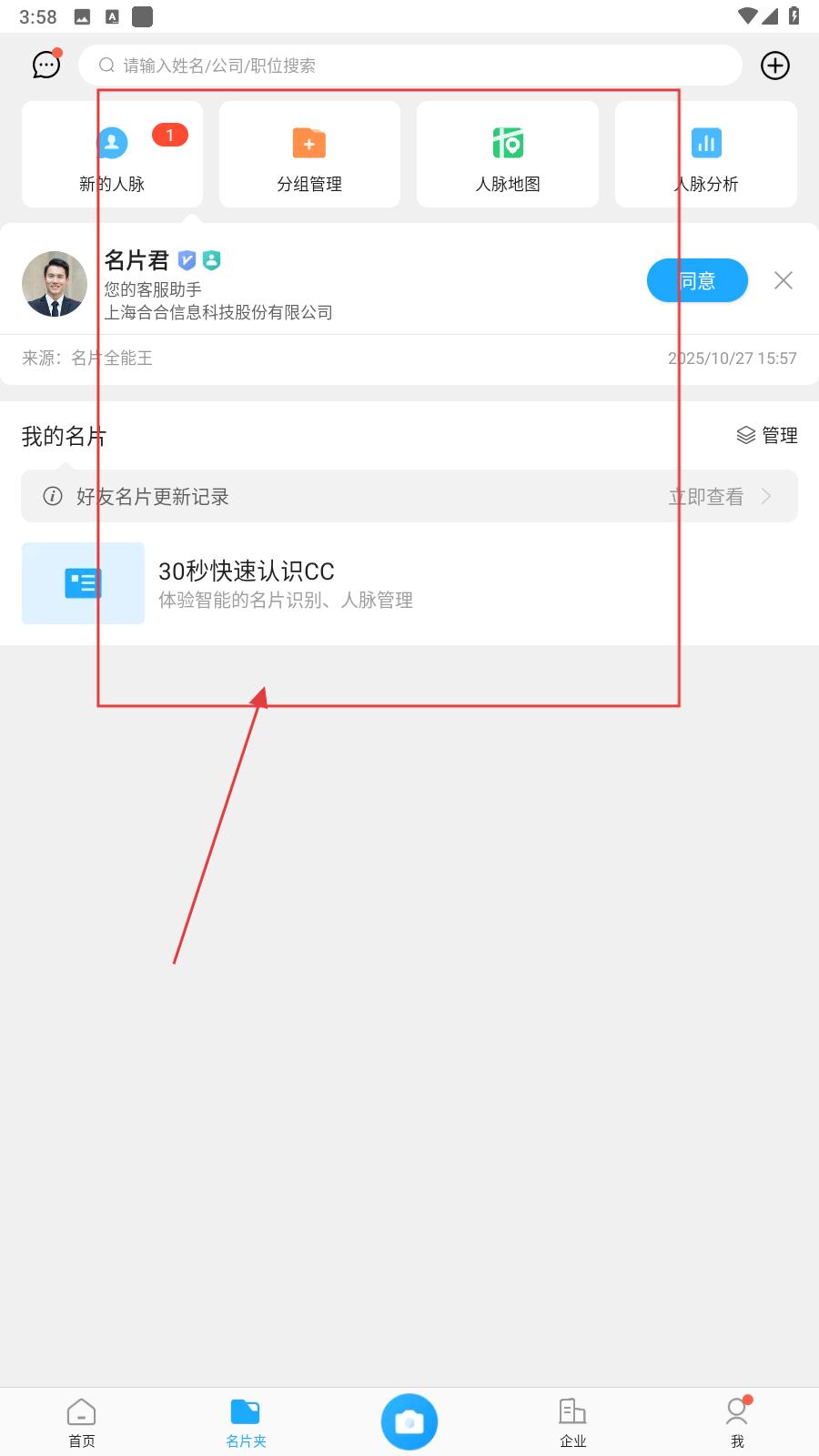3、用戶進入名片夾界面有新的人脈、分組管理、人脈地圖、人脈分析功能,可查看好友名片更新記錄,體驗30秒快速認識CC的智能名片識別和人脈管理服務。