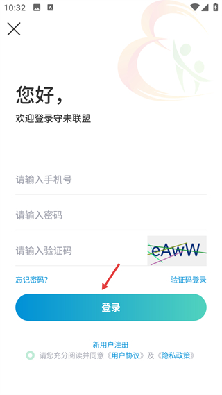 3、進入守未聯盟,確認同意協議,在登錄頁填手機號,密碼,勾選閱讀并同意條款,點擊登錄使用。