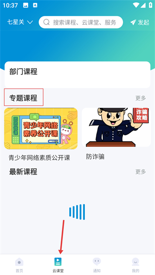 3、點首頁底部云課堂,進入后能看到專題課程分類,可選擇適合的未成年人法治教育課程板塊。