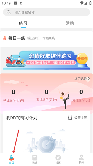 1、進入首頁,可參與每日一練,邀請好友結伴練習,查看今日及累計練習數據,DIY練習計劃并設置提醒。