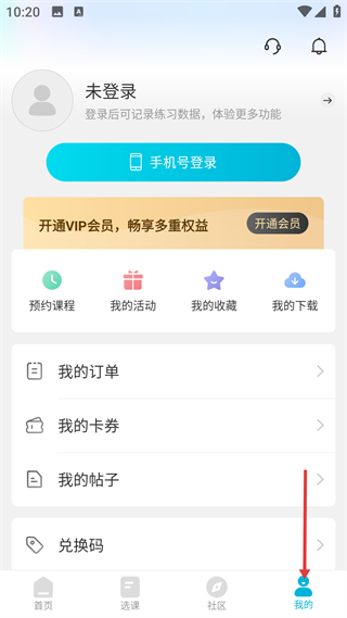 4、進入個人中心,可通過手機號登錄記錄數據,開通VIP會員,使用預約課程我的收藏等功能管理個人服務。