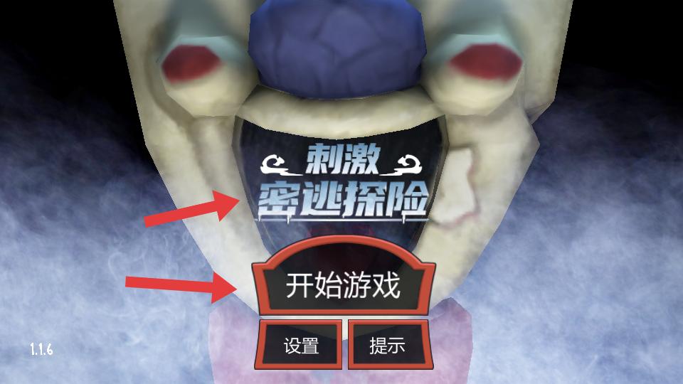 1、進入游戲,可點擊開始游戲開啟密室逃脫探險,也能在設置調整游戲相關選項,或在提示里獲取幫助。