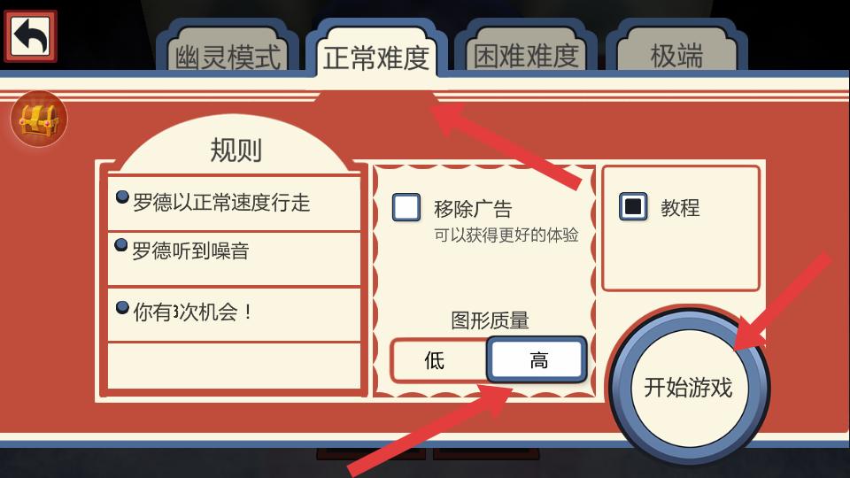 2、選擇正常難度等游戲難度,查看規則,還能選擇是否移除廣告,設置圖形質量,之后點擊開始游戲進入。