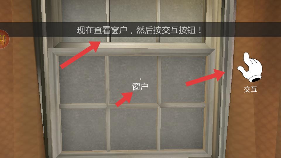 3、游戲中按照提示查看窗戶,然后按下交互按鈕,與窗戶進行互動,推進密室逃脫的流程。