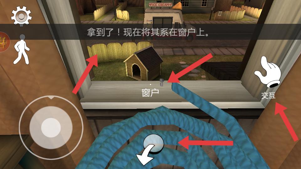 4、拿到物品后,按照提示將其系在窗戶上,繼續與窗戶等場景元素交互,完成密室逃脫中的任務。