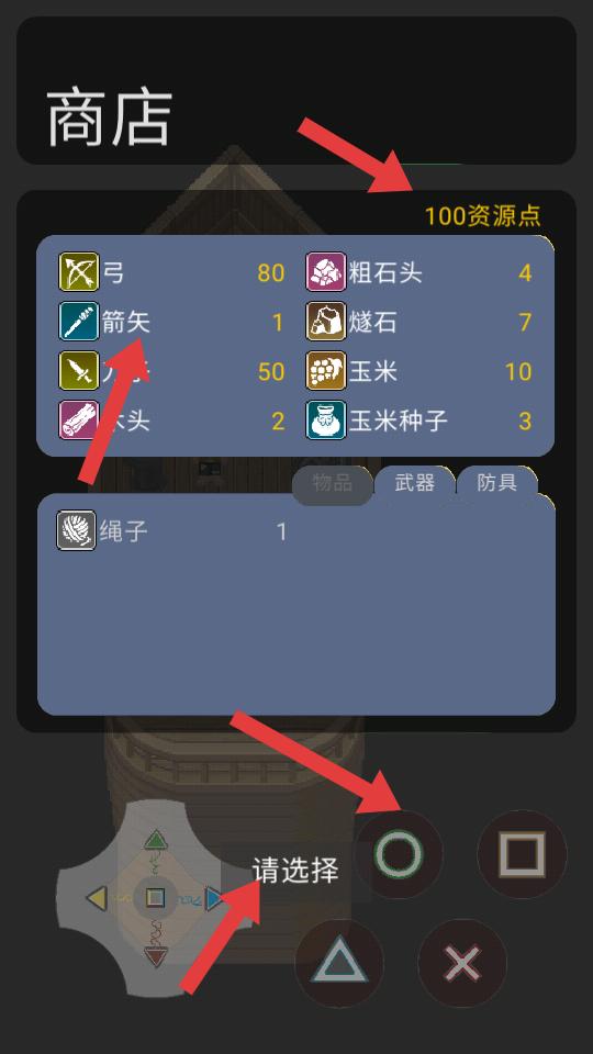 4、在商店里,有100資源點,可購買弓,箭矢等物品,選擇想要的物品后,點擊請選擇完成購買操作。