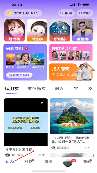 1、交友板塊有金幣任務、各類榜單,設興趣群組、找朋友板塊,是用戶拓展社交圈的平臺。