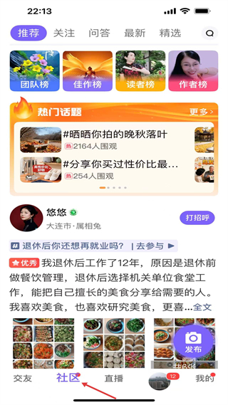 2、社區板塊有團隊榜、熱門話題等,展示用戶分享的內容,如退休再就業經歷,支持用戶發布內容互動。