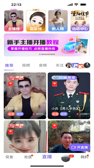 3、直播板塊有主播榜、新人榜等,展示唱歌等直播內容,還有新手主播教程,支持用戶開直播互動。