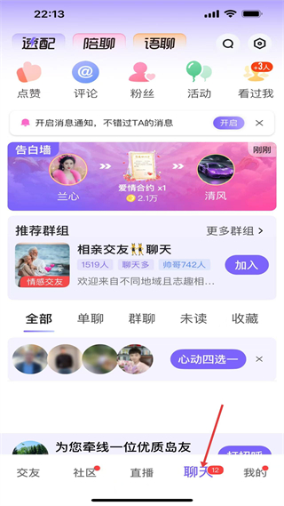 4、聊天板塊有適配、陪聊等功能,設告白墻、推薦群組,還有消息分類板塊,是用戶聊天交友的入口。