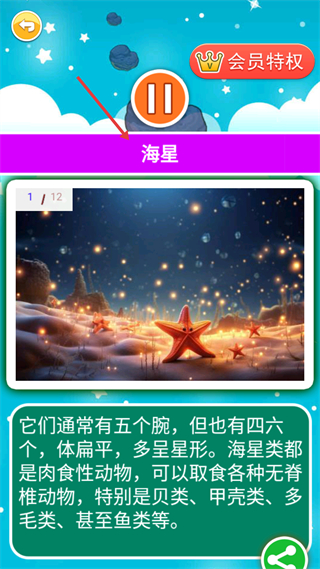 2、海洋生物子分類下可查看海星的科普,它通常有五個腕,體扁平呈星形,是肉食性動物以貝類等為食。