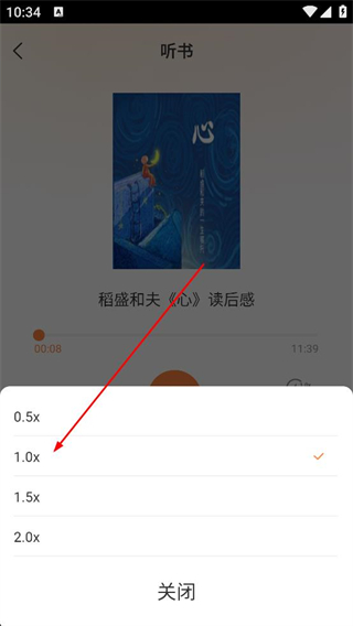 3、在倍速選擇彈窗中選擇想要的播放速度如1倍,確認選擇后點擊關閉按鈕,返回播放頁面繼續收聽音頻。