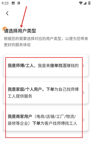 1、用戶類型選擇頁,提供師傅工人、家庭個人、商家三類用戶選項,便于匹配對應服務與功能。