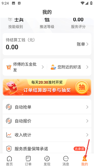 2、我的頁面,展示師傅端技能等級、待結算工錢等信息,包含自動搶單、收入統計等功能入口,是個人業務管理界面。