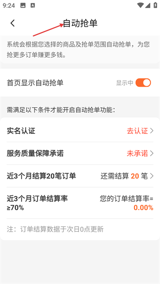 3、自動搶單頁面,說明該功能需滿足實名認證、訂單結算等條件,助力師傅獲取更多訂單,提升接單效率。