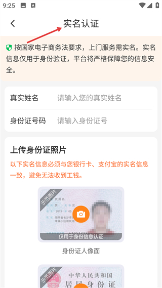 4、實名認證頁面,需填寫姓名、身份證號并上傳證件.照是開啟服務功能的必要前置操作,保障信息合規。