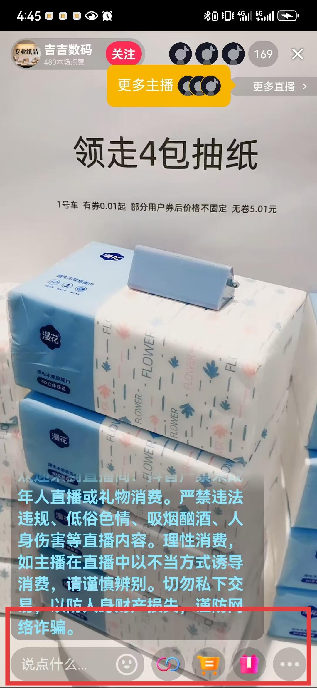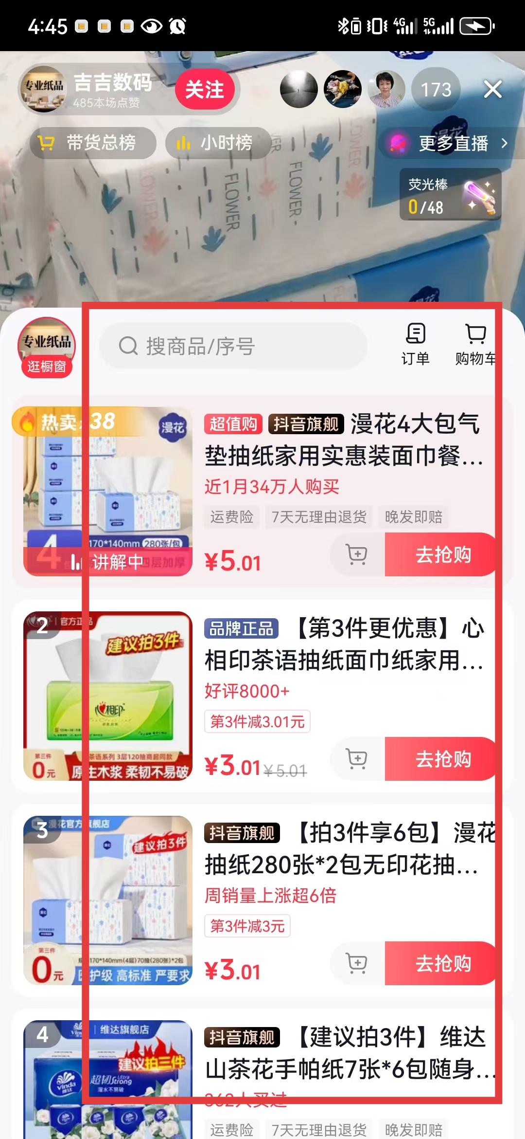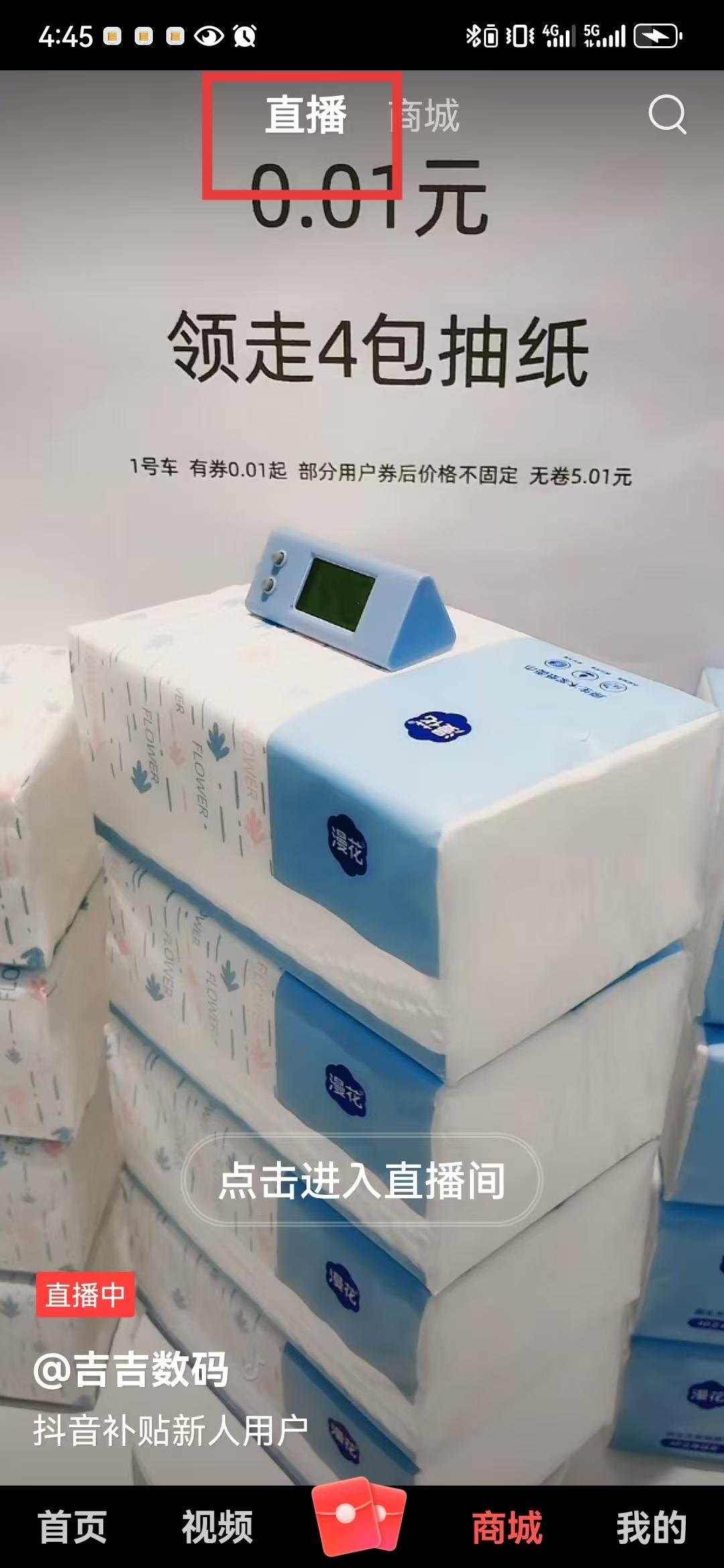2、點擊直播后會進入直播推薦頁面,展示正在直播的內容,比如圖中展示的抽紙促銷直播,選擇感興趣的直播點擊直播畫面中的點擊進入直播間按鈕。
