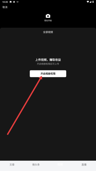 4、點擊開啟相冊權限,獲取權限后,就能從相冊中選擇視頻,進而完成作品發布,還可賺取收益。