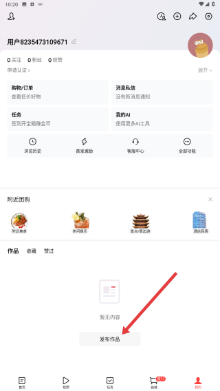 1、進入APP個人頁面,能看到用戶相關信息,還有購物訂單、任務等功能入口,下方有發布作品按鈕。