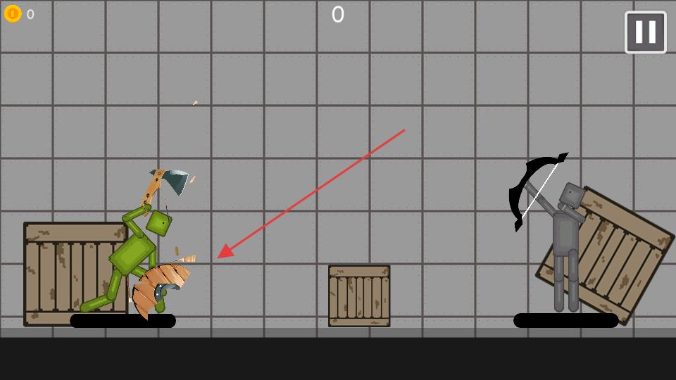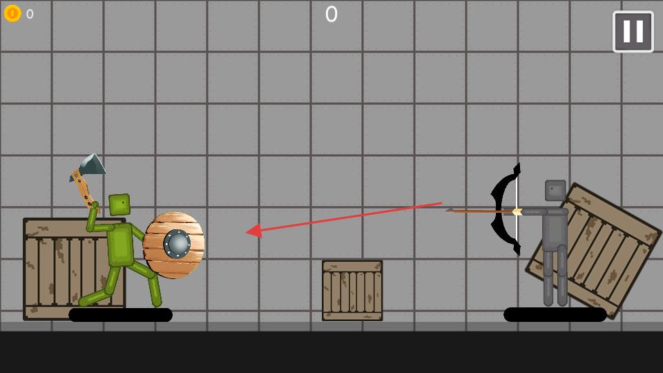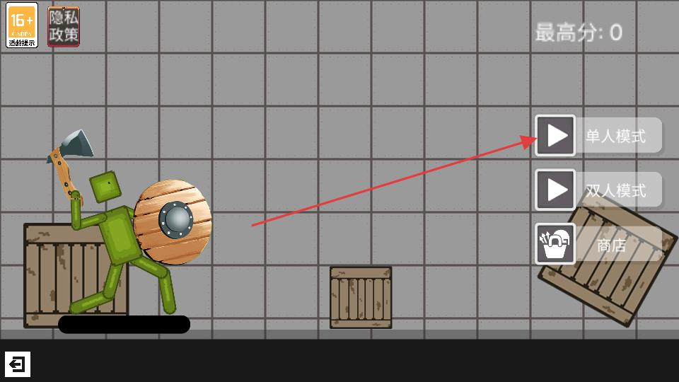 1、進入游戲點擊單人模式按鈕,進入單人對戰場景,此時會看到綠色木偶和持弓箭的灰色木偶,準備操控綠色木偶進行戰斗。