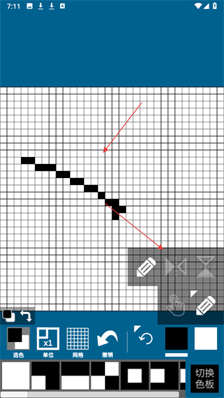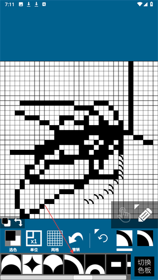 2、進入繪圖頁面,利用底部工具,選色后通過畫筆在網格畫布點擊、拖動,繪制圖案,若有誤可借助撤銷功能修正,逐步構建像素作品雛形。