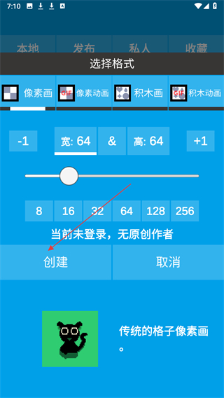 2、可選擇像素畫、像素動畫、積木畫、積木動畫等多種創作格式,設置畫布的寬高尺寸后點擊創建開始繪制。