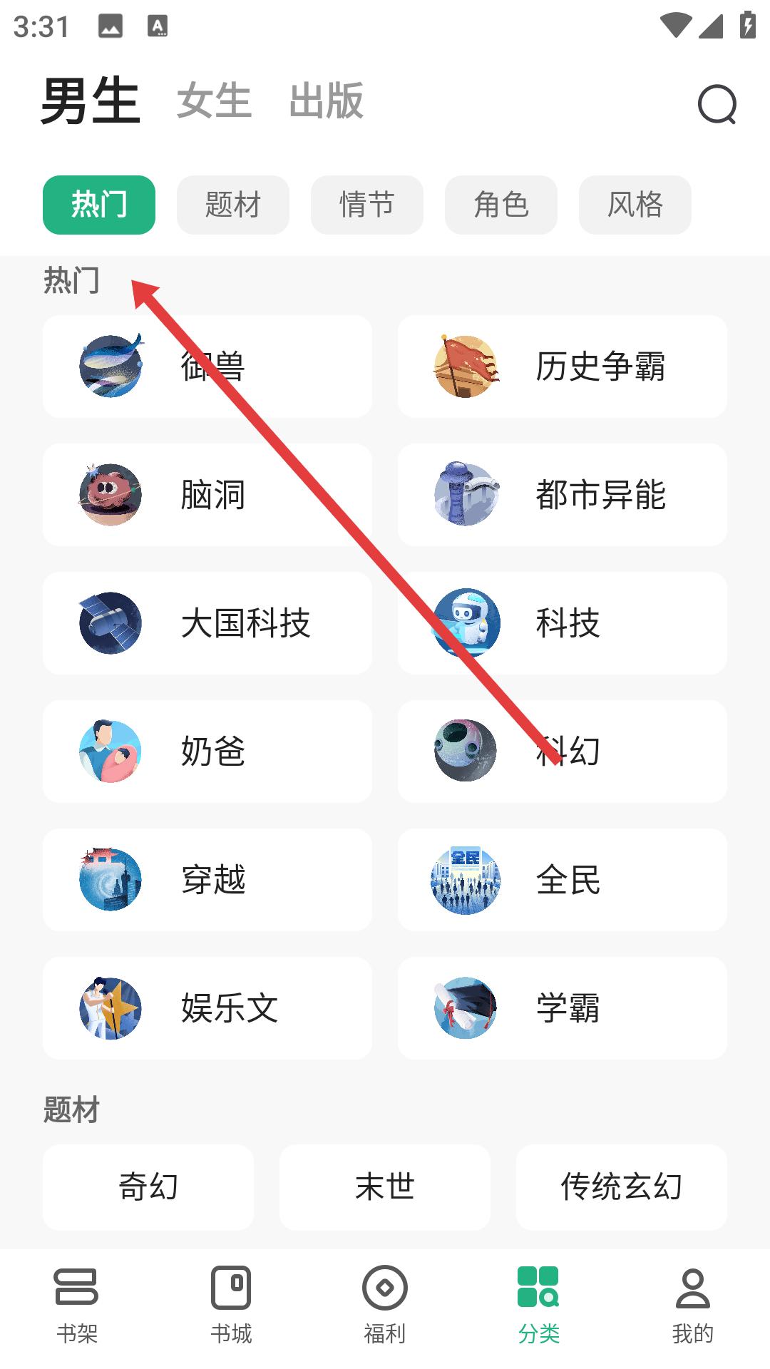 1、進入分類頁面,在頁面上方的分類欄里,從男生分類切換到女生分類,準備查找女生類書籍。