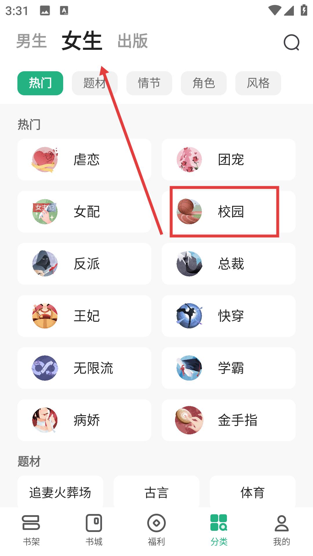 2、進入女生分類頁面后,瀏覽熱門標簽等,找到校園標簽,點擊校園標簽,進入校園類書籍的篩選頁面。
