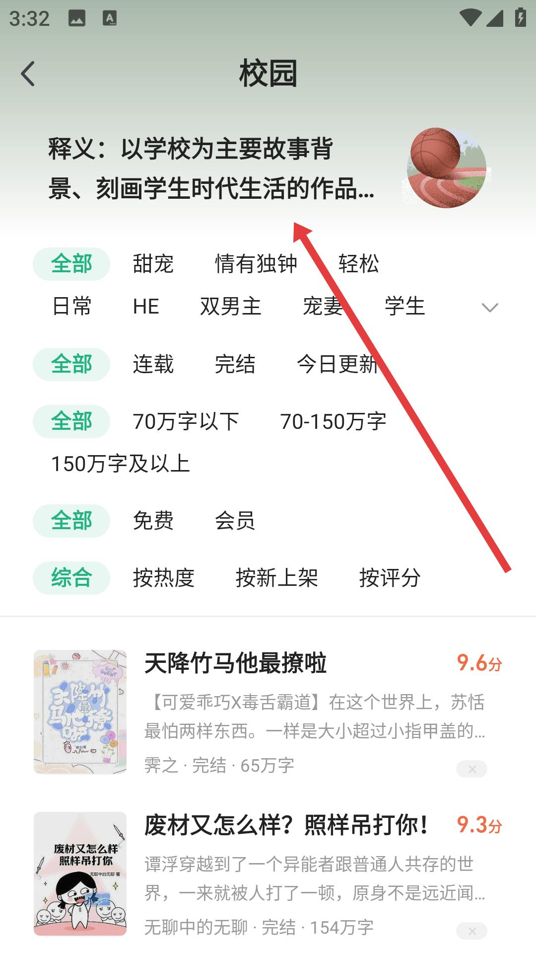 3、在校園類書籍篩選頁面,查看校園類書籍的釋義,了解這類書籍的特點,同時可根據甜寵、連載狀態等進一步篩選書籍。