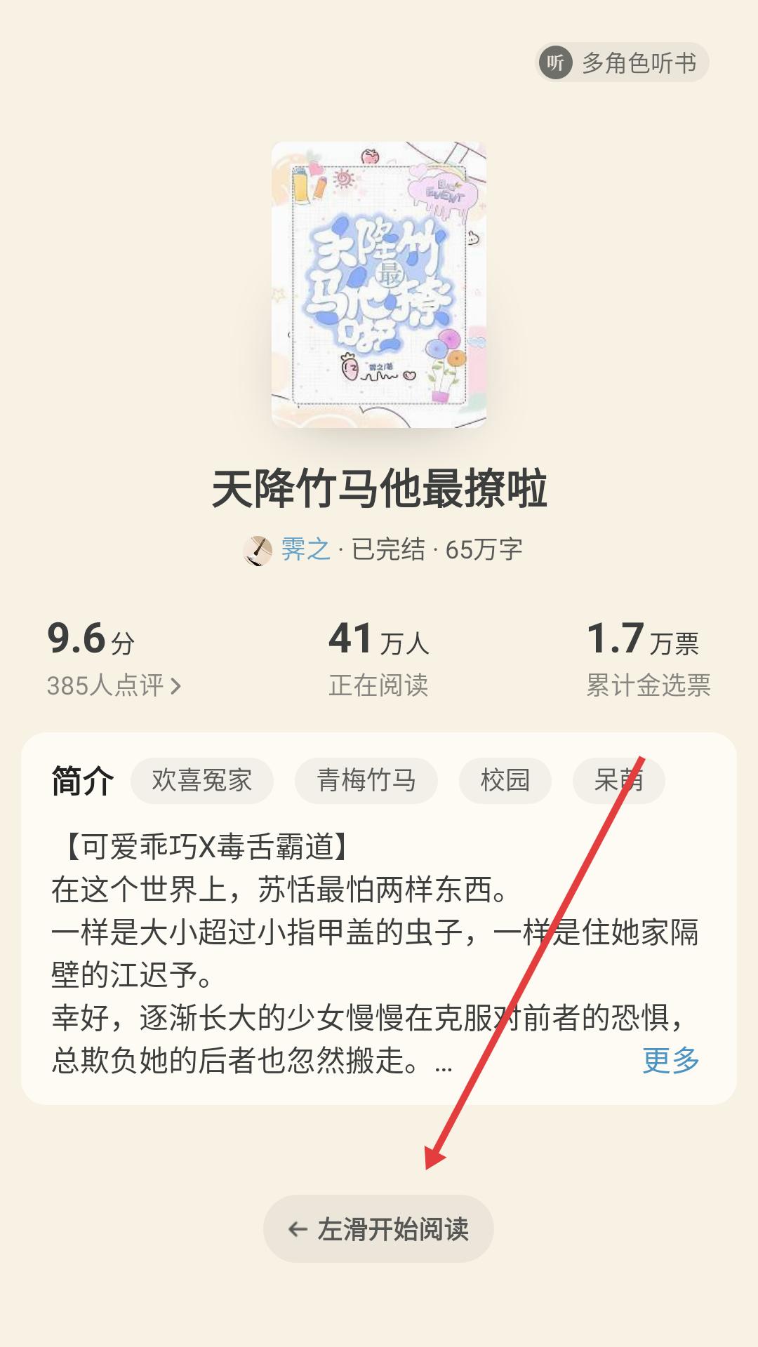 4、在篩選出的校園類書籍中找到天降竹馬他最撩啦這本書,點擊進入該書的詳情頁面,查看書籍簡介等信息,左滑即可開始閱讀。