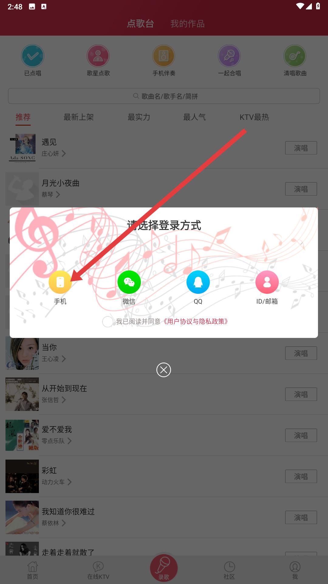 3、點擊演唱后會彈出登錄方式選擇界面,可選擇手機、微信、QQ等方式登錄,登錄后可使用更多K歌功能。