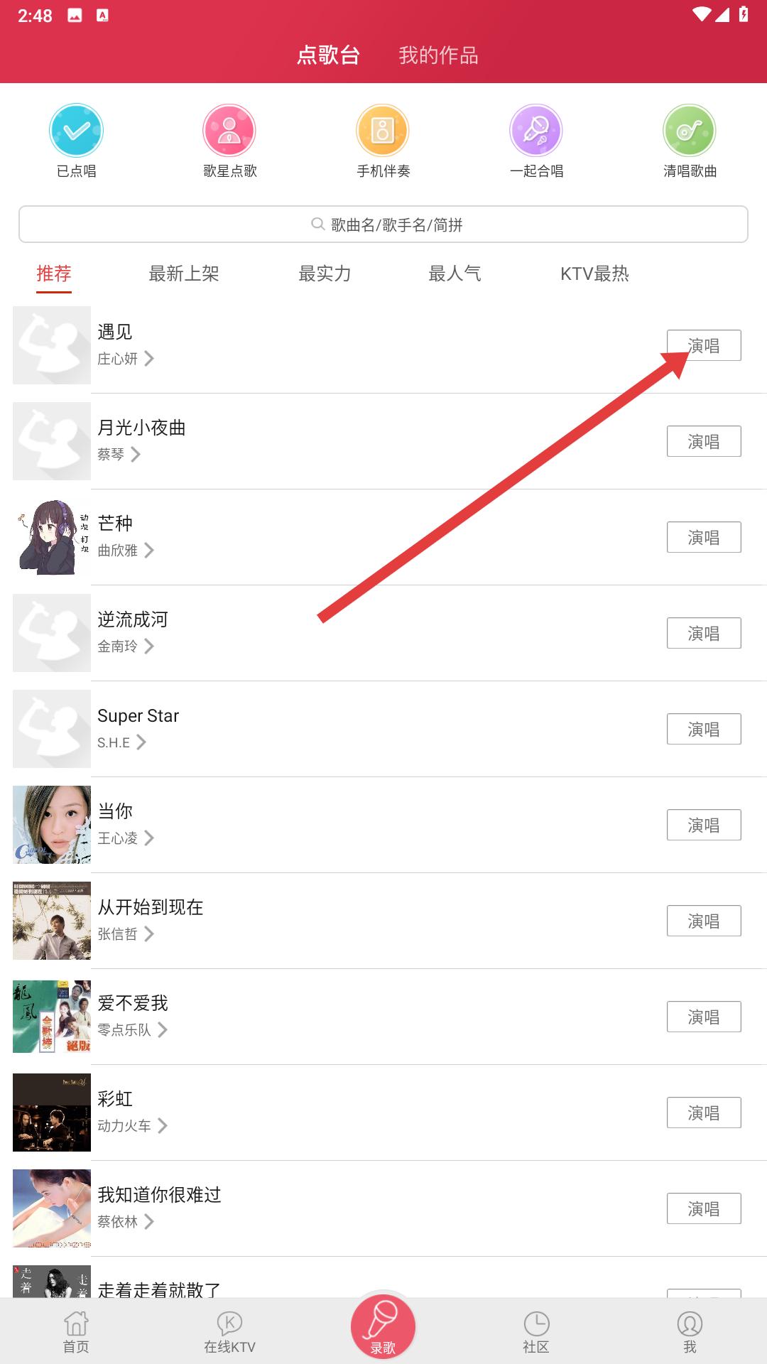 3、點擊錄歌界面,含點歌臺我的作品,有點歌功能及推薦歌曲列表,可點擊演唱開啟。
