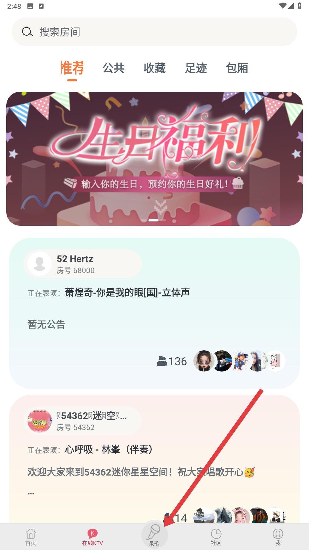 1、進入應用首頁,可見搜索房間欄,推薦、公共等分類標簽,還有生日福利活動,點擊底部錄歌可進入點歌臺。