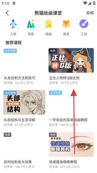 1、進入軟件熊貓繪畫課堂頁面,瀏覽人體、場景等分類下的推薦課程,選擇正比人物轉Q版比例課程,進入課程詳情頁。