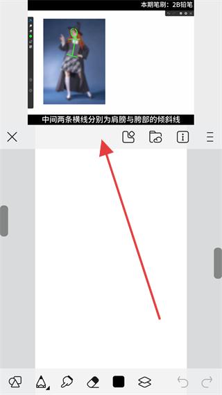 4、在繪畫界面根據課程中的輔助線提示,如肩膀與胸部的傾斜線,進行人物繪畫,借助課程知識提升創作技巧。