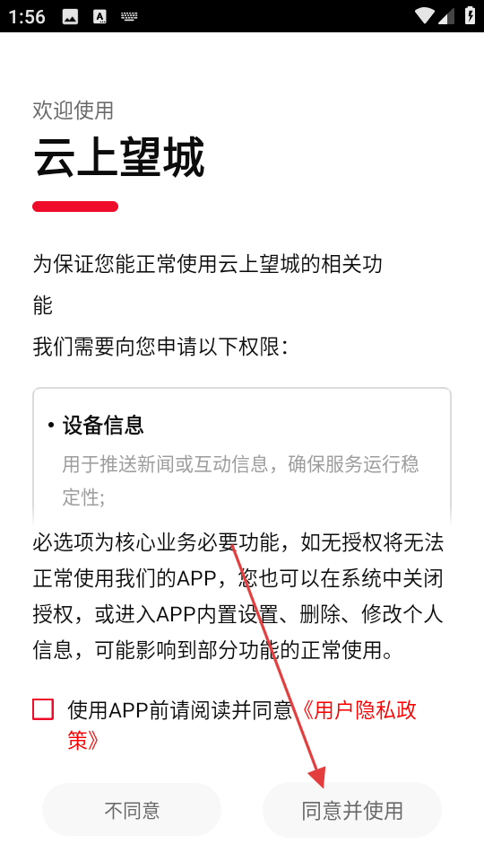 1、首次打開APP會彈出用戶協議及隱私政策界面,需仔細閱讀后點擊同意才能繼續使用APP,這一步是為了確保用戶了解并同意平臺使用個人信息的規則。
