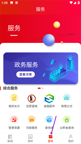 3、進入服務界面,能使用政務服務及綜合服務功能,包含我的長沙、志愿望城等選項,可獲取各類政務與生活服務。
